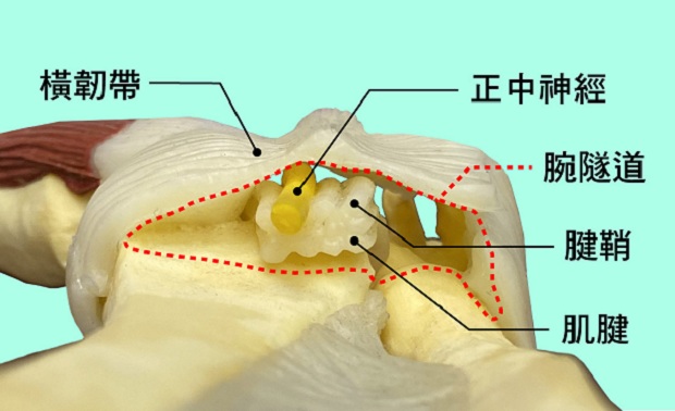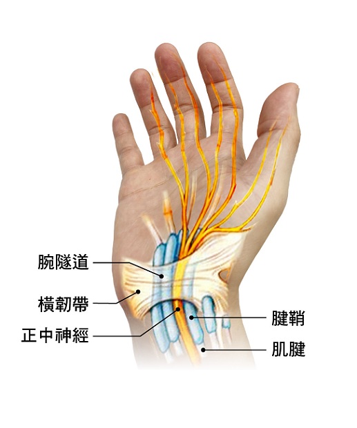手腕隧道是由腕骨及橫腕韌帶所構成,其中有九條肌腱和一條正中神經(Median nerve)通過,正中神經(Median nerve) 是負責支配大拇指的動作以及大拇指、食指、中指和一部份無名指的感覺神經,當腕隧道內的壓力過高,正中神經受到壓迫就會導致手掌區域出現麻木、灼熱、刺痛等的手腕隧道症候群症狀。