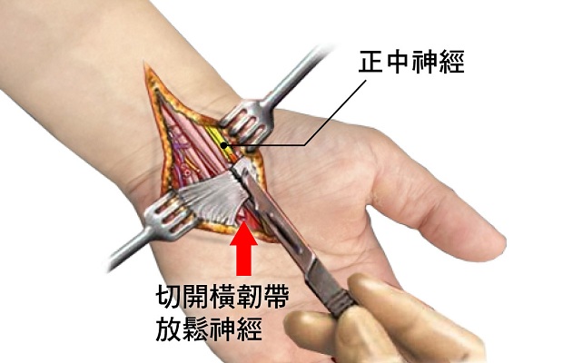 局部麻醉後,在手腕到掌心處切開一條4到6公分的傷口,將手腕中被壓迫到神經的腕橫韌帶切開解除腕隧道的狹窄情形,可減輕對正中神經的壓迫,手術時間約30到60分鐘,手術後由於會失去握力,必須先裝支架做支撐,約半年後才能開始復健訓練。