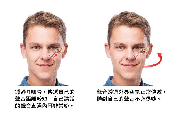 ▲一講話發出聲音,聲音直接經耳咽管的捷徑傳至內耳,可聽到講話的回音。