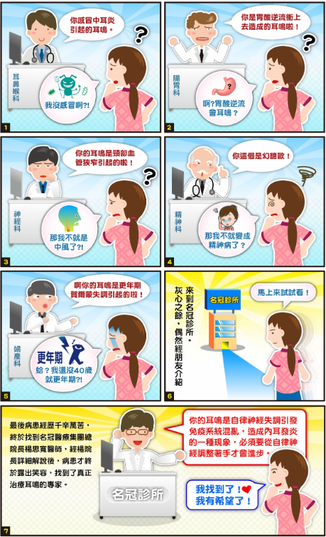 名冠診所「耳鳴複合式雞尾酒療法」為中西醫結合耳鳴進階治療的自費療程。建議已在醫學中心或耳鼻喉科診所接受過許多初步治療後仍未改善的病友選擇此項治療。